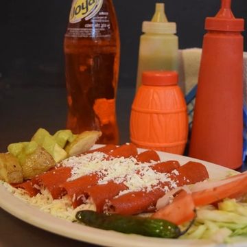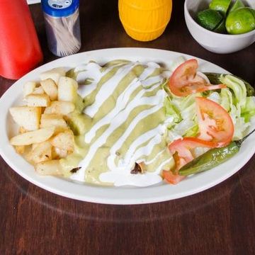 5 Enchiladas de queso panela acompañadas con lechuga, tomate y papas.