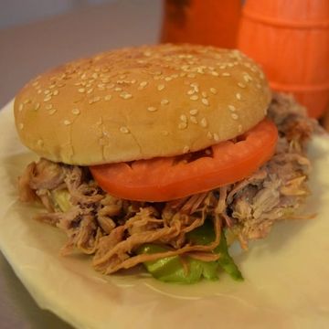 Barbacoa o arrachera con aguacate, tomate, cebolla y pan de hamburguesa.