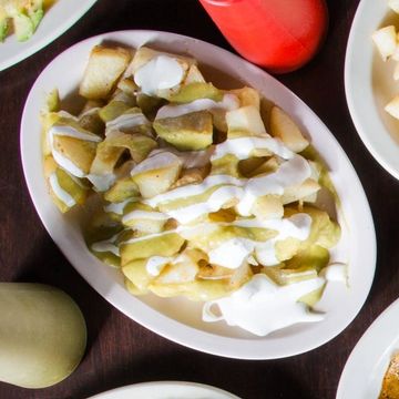 Orden de papas a la francesa o en cuadros acompañada con aderezos.