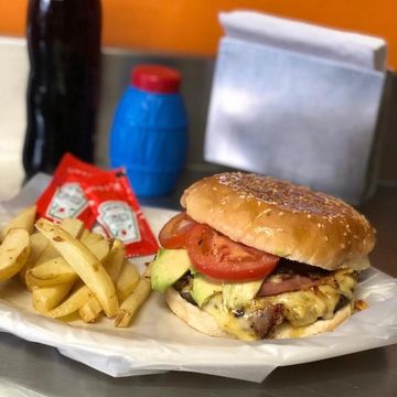Carne 100% de res, jamón, queso gouda, aguacate, tomate, cebolla y aderezos.