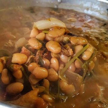 Tazón de frijoles charros. Especiales con queso gouda y carne.